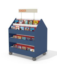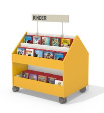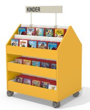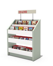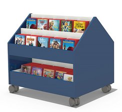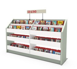 Bac à médias double face mobile équipé de 3 ou 4 compartiments par côté, selon la hauteur. Les 4 roues pivotantes sont équipées d'un frein.